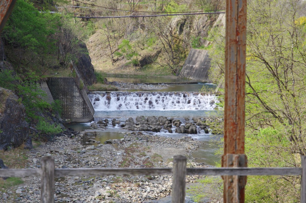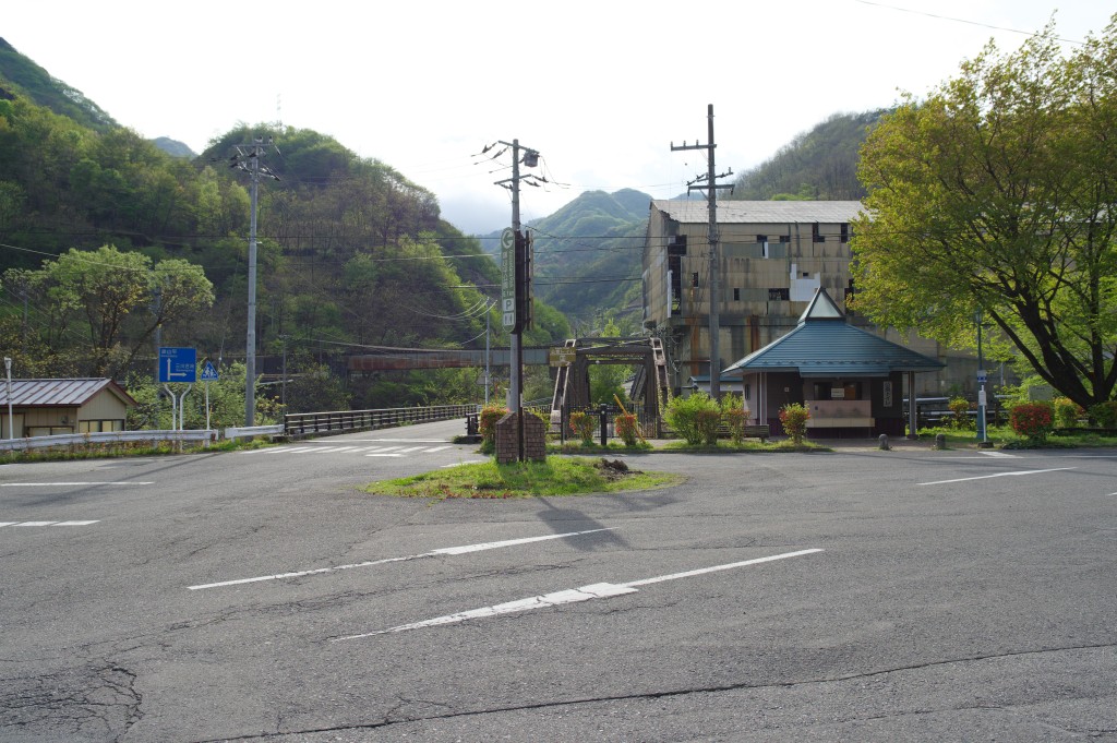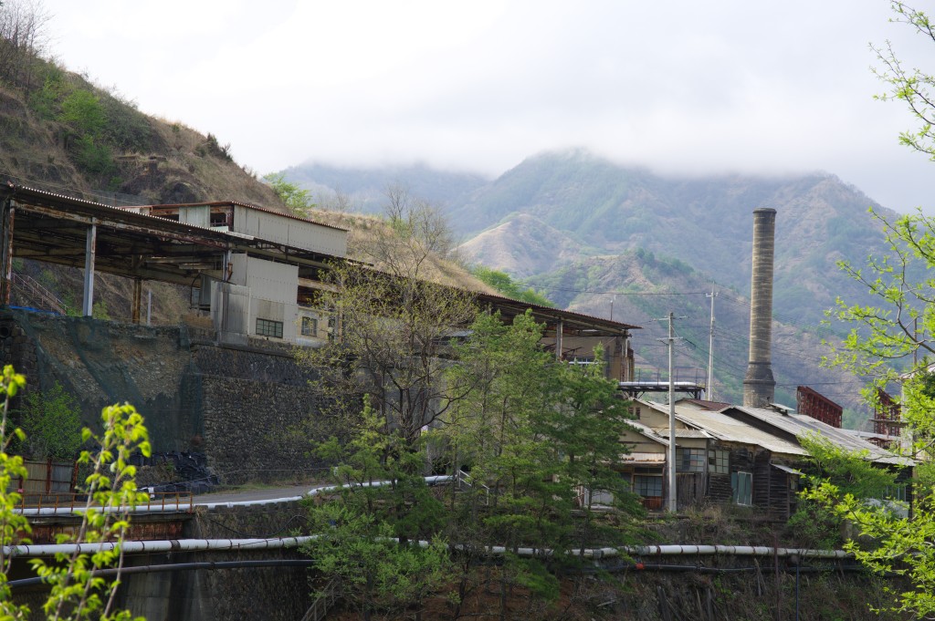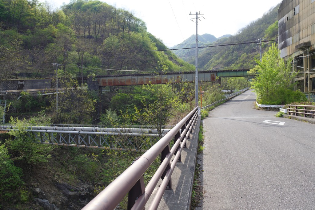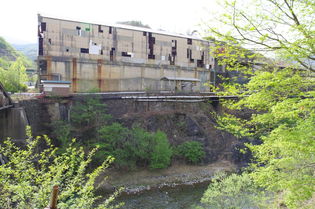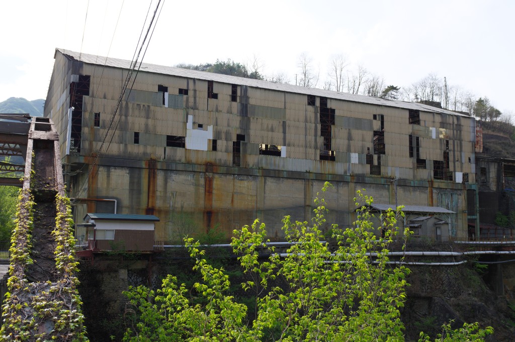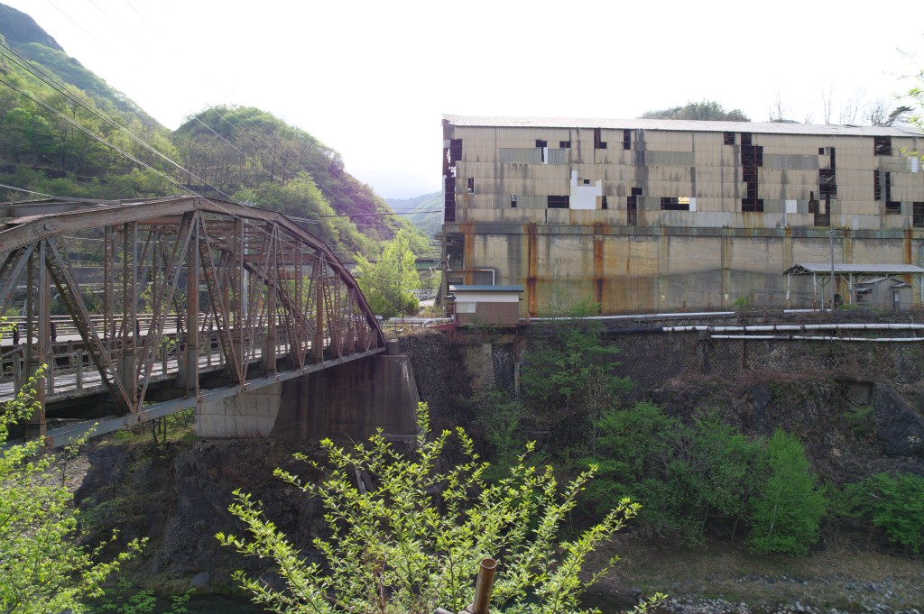 対岸に見えるのは足尾銅山の本山精錬所跡で、銅の産出量増加に対応するために当時の最新技術により明治17年に稼働開始しています。現在は大きな廃墟の建物と煙突などがあり、国の史跡に指定されています。1914年(大正3年)には貨物用の足尾本山駅が開業していますが昭和末期に廃止されています。