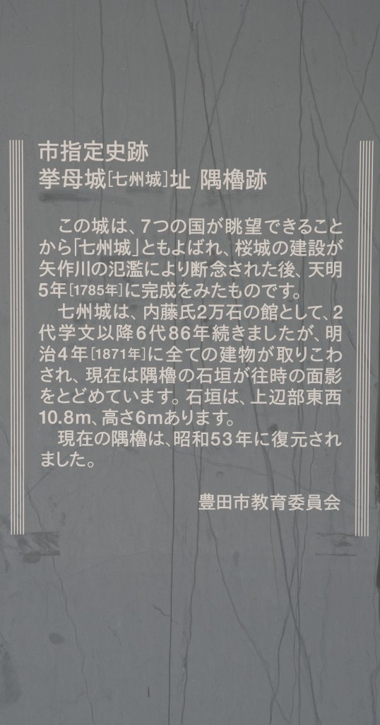 2024年7月、愛知旅行に行きました。挙母城(ころもじょう)は豊田市の城跡で、1782年(天明2年)に築城されています。童子山の高台に位置し、三河国、尾張国、美濃国、信濃国、伊賀国、伊勢国、近江国の7つの国が見えることから七州城(しちしゅうじょう)とも呼ばれます。現在の豊田市の中心部に当たる拳母藩の藩庁が置かれました。遺構は櫓台の石垣が残っており、1978年(昭和53年)に隅櫓が復興されています。本丸跡は豊田市美術館と城跡公園として整備されています。