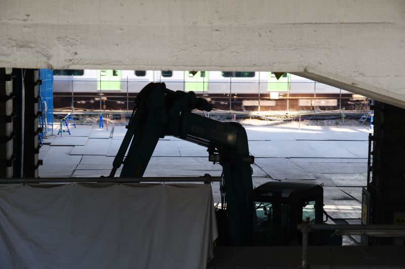 歩道のすぐ横では京急線の電車が沢山行き来しています。辺りは工事中の雰囲気で、高架下も(一部は駐輪場で)資材置き場のような感じです。