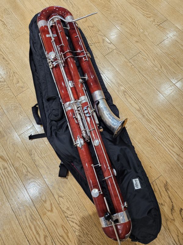 コントラファゴットのギグバッグ(ソフトケース)はアルティエリ製で、約1.8kgとかなり軽量です(アマティのハードケースは9kg!)。ただ近年は販売していないようです。