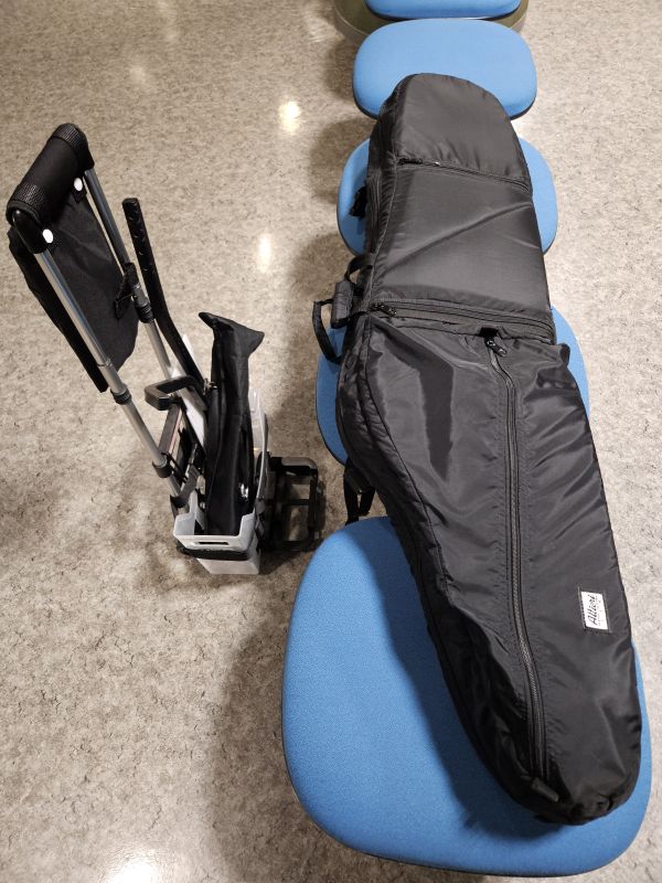 立ち止まった時や電車内ではコントラファゴットのギグバッグを支えるだけで良いので、より手がフリーになりました。カートを置いておけるこの気楽さは良いですね!置いておく時は「重さがゼロ」です。