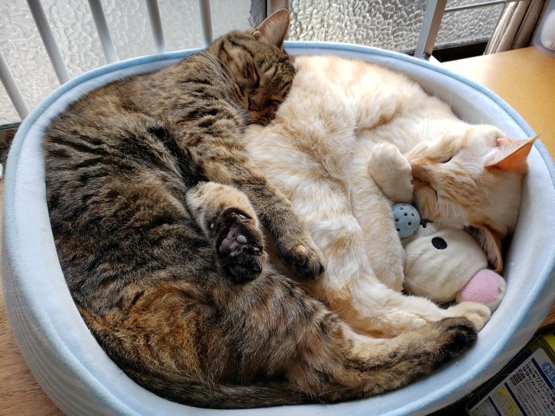 最近気温が下がってきたので猫達はいつものように2匹でくっつくようになりました。寝てる時間も多いように感じます。