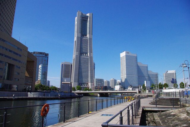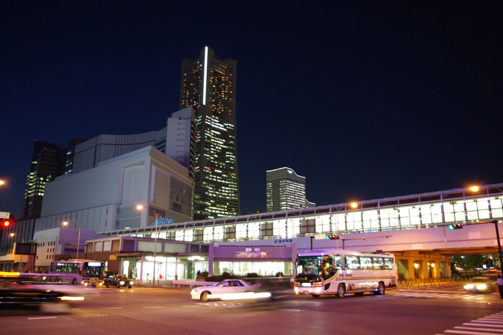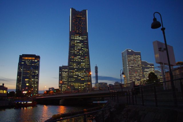 2009年8月、桜木町駅付近を撮影しました。駅の近くを流れる大岡川は「大岡川夢ロード」という遊歩道が整備され、カモメなどが集まる憩いの場になっています。遊歩道は風景が開け、横浜ランドマークタワーなどのみなとみらいの高層ビル群を眺める事が出来ます。日が暮れると深まっていく夕空を背景に川に停泊する屋形船や暖かい街頭の光と共にみなとみらいのビル群の美しい夜景が見られます。
