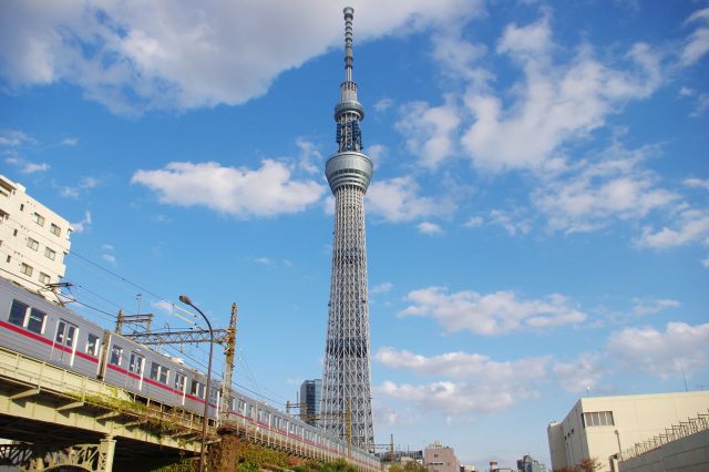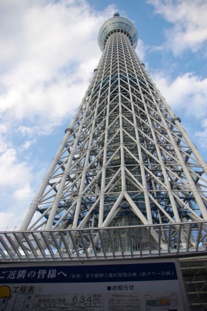 2011年11月、浅草(台東区)と東京スカイツリー付近(墨田区)に行ってきました。この日は浅草寺を訪れたの後、隅田川付近からスカイツリーへと歩いて行きました。浅草通りから住宅街を抜けて牛嶋神社方面へ、そして伊勢崎線沿いにスカイツリーに近づいて歩いていきました。周囲に高層ビルが一切ないので、途中のどこからでもとても目立ちます。業平橋まで来ると川の周辺は空を見上げる人だかり。本当にその高さを実感しきれないほとの、空に向かって細長い巨大な塔がそびえ立つ。まだ周辺施設(ソラマチ)を含め工事中ですが、つい先日世界一高いタワーとギネス登録されたばかりの壮大なタワーです。ブルジュ・ハリーファに次いで世界で2番目に高い建造物でもあります。2012年5月22日に開業予定。