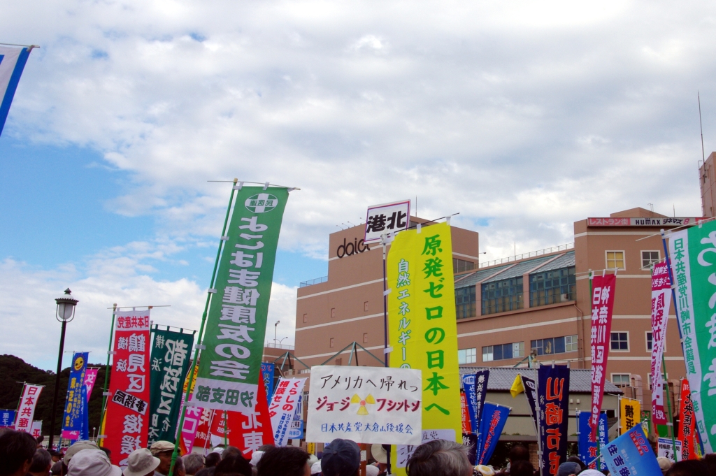2011年9月、神奈川県南東部の江ノ島・鎌倉・横須賀を回りました。横須賀ではJR横須賀駅から京急汐入駅前を経て横須賀中央駅まで歩いて行きました。海側には自衛隊や米軍の基地があり、大きな自衛艦・軍艦・潜水艦なども見かけました。海沿いのヴェルニー公園を進み、スカジャン発祥の地の商店街のドブ板通りを通り、途中で名物の海軍カレーを食べて横須賀中央駅へ。アメリカの雰囲気が融合した海軍港街として人気がある一方で当日は反原子力の大規模なデモが行われ、町中を練り歩いていてものものしい雰囲気の声が響き渡っていました。