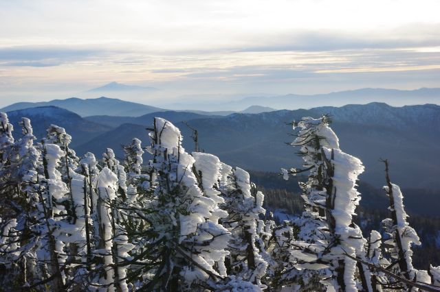 標高1500mを越える見返峠で下車すると外は静かで寒く、久々に触れる雪は圧縮されて形が崩れにくい。いざ風景を眺めると、標高の高いところに幅広く広がる雪を吹き付けられた樹氷群、遠くまで何重にも連なる幻想的な山並み、明瞭に見える雄大な岩手山や秋田駒ヶ岳、畚岳(もっこだけ)、今まで見たことのない「絶景」でした!天気が良くてどの方向も遮られずに遠くまで眺めることができ、日本海近くにある鳥海山が見えることもかなり珍しいという。11月の開通も珍しく、通常吹雪で車外に出にくい事も多いと言われる中、これほど天気に恵まれて視界が良く、さらに無風で寒すぎず、この日の午後しか味わうことのできない限定的な、本当に奇跡的で貴重な風景でした。