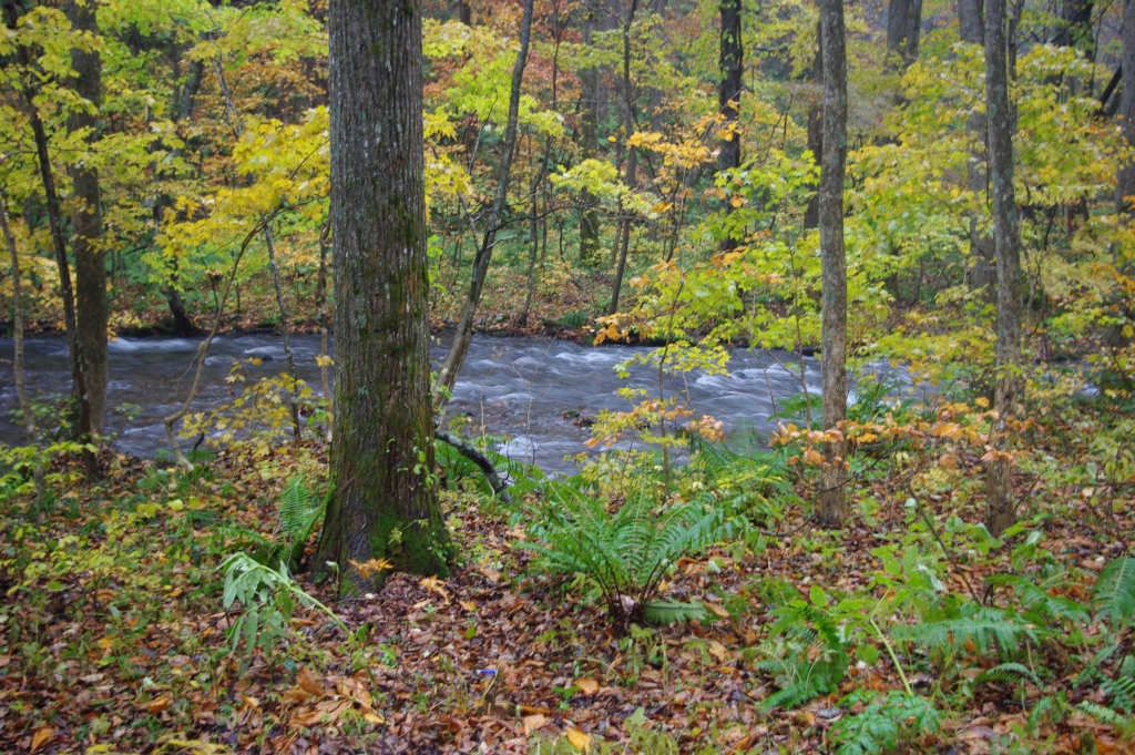 2012年10月、紅葉時期に東北旅行に行きました。十和田湖の後は湖から流れ出る唯一の川である奥入瀬渓流へ。奥入瀬渓谷では雨の中、銚子大滝付近から下流方面へ散策しました。ぬかるんでいて足場は悪かったですが、遊歩道からは浅い渓流、緑や黄色が中心の木々、苔の生えたゴツゴツした岩、川を渡している倒木、何箇所かあった小さな滝等の自然風景を堪能しました。雨ながら流れは透明であり、むしろ雰囲気的にも渓流らしくて素晴らしいものでした。渓流はから併走する道路は意外に近くて高低さも少なかったです。