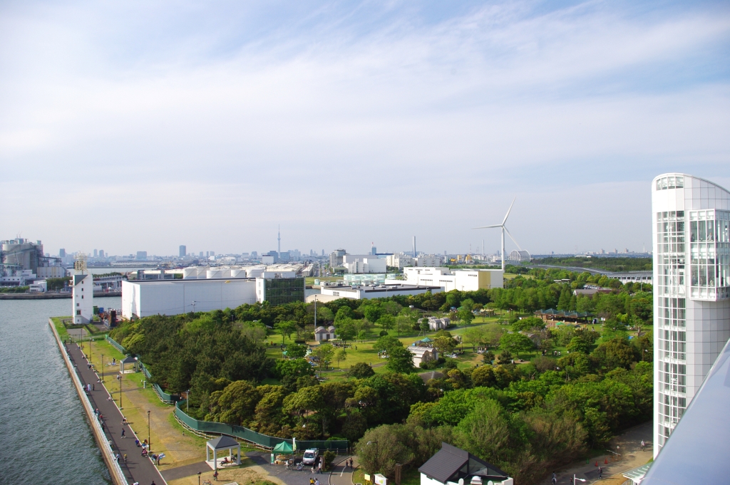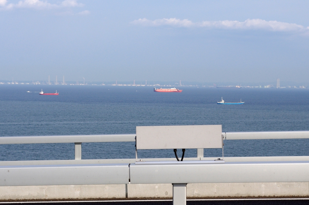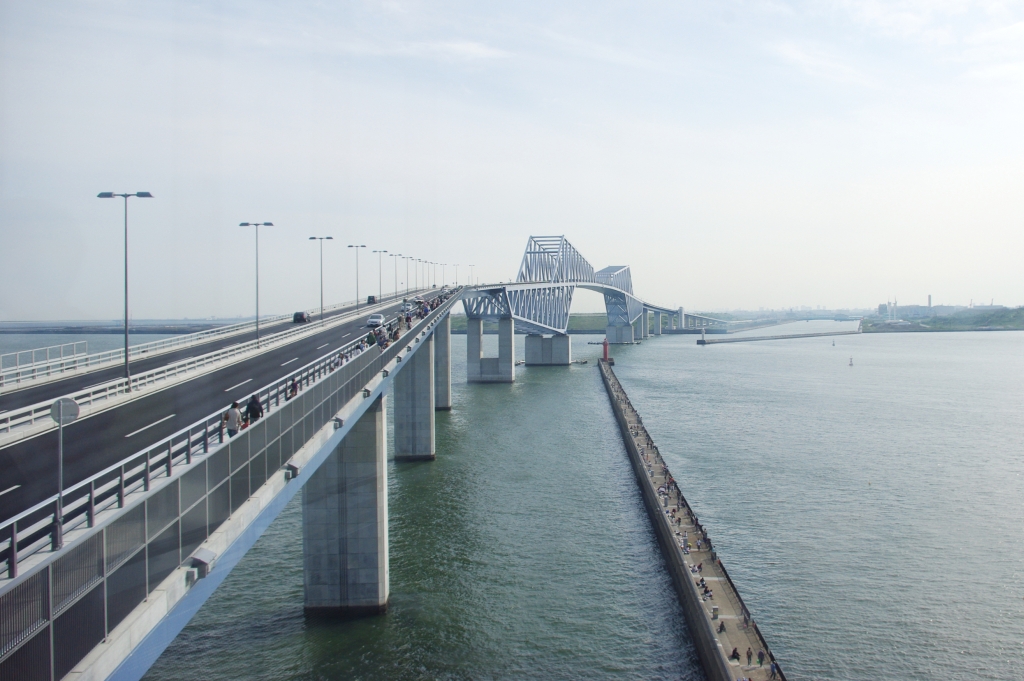 2012年5月、東京ゲートブリッジを訪れました。若洲公園にあるエレベーターで数分並び8階へ登り(階段もあり)、東京湾港湾道路の歩道へ。下を見ると怖いぐらいに高さがあり、海風も強く吹いていました。橋の上からは東京スカイツリー、東京タワー、お台場、羽田空港、東京湾アクアライン、房総半島、TDR、360度広範囲の開放的な風景を眺める事ができました。橋を2kmほど歩いて「中央防波堤外側埋立地」側へ渡れますが、現在は降りることが出来ず戻るしかありません。橋を進む途中には羽田空港へ向かう低空の飛行機がたくさん通過し、橋構造の高さ制限を実感できます。橋の下も船が通過していきます。埋立地側は広大でひとけのない空き地という感じでしたが、いずれ「海の森公園」という広大な公園ができるようです。