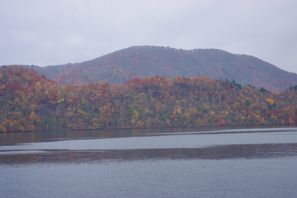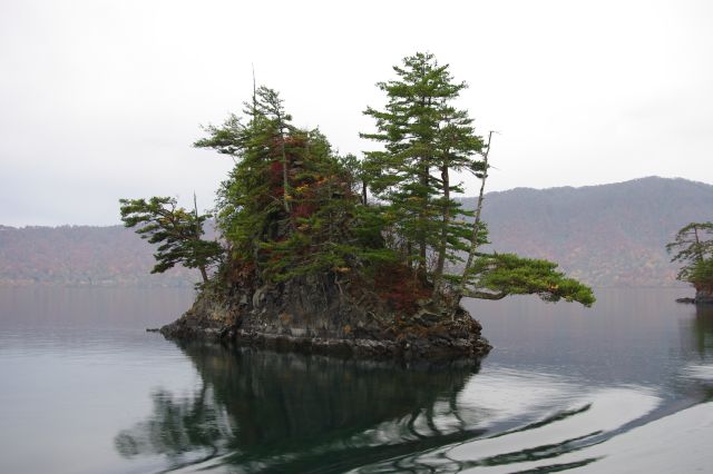 2012年10月、紅葉時期に東北旅行に行きました。十和田湖周辺は紅葉の終盤、天気も小雨から雨へと変わり、あまり恵まれた条件ではありませんでした。十和田湖畔の子ノ口(ねのくち)港から遊覧船に乗り、御倉半島・中山半島という2つの大きな半島を左に見ながら沿うように、小雨の中を50分かけてゆっくり進みました。緑色の針葉樹を含め、バリエーション豊かな、比較的落ち着いた色ながら部分的に鮮やかな色の紅葉が一面に混在する美しい風景でした。赤い岩肌、小さな岩島に木が生えている所もありました。