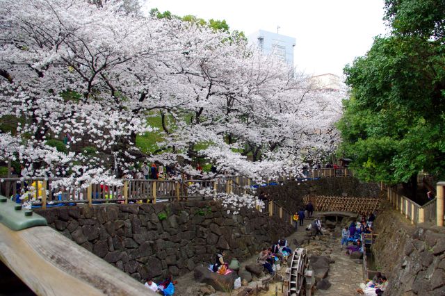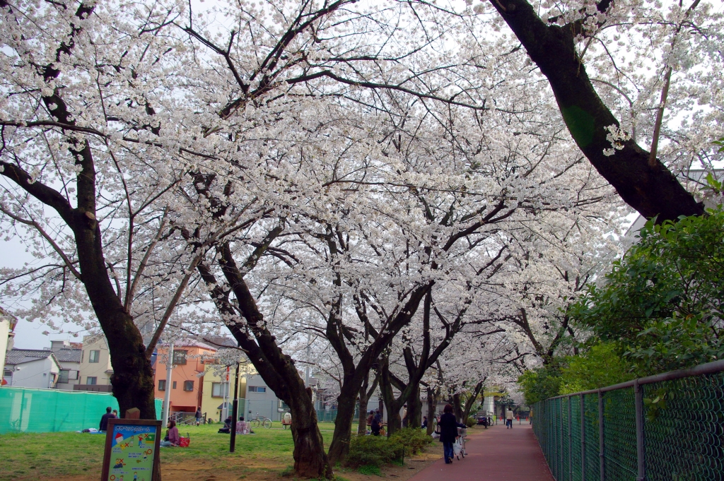 2013年3月、桜の季節に東京の桜の名所を訪れました。王子駅前と平行する形の高台の飛鳥山公園へ大勢の人が列を作っていました。山へは大勢の人並みに流されるようにしばらく階段を登っていきますが、斜面には短い「飛鳥山モノレール」がありました。丘に登るとほぼ満開の桜が細長い園内に屋根のように連続して覆うようなダイナミックな情景で、シートを広げお花見をする人でとてもにぎわっていました。大勢の人が居て砂埃で多少視界が濁っていて、人が多く立ち止まってゆっくり桜を眺めることはできず落ち着かない感じでした。奥には古い都電やSLなどが配置された、子供達が多数集まる広場がありとてもにぎやかでした。公園周囲を走る都電の警笛音も頻繁に聞え、東側には新幹線なども眺めることができました。飛鳥山近くの音無親水公園は石神井の旧流路を利用して作られた公園です。石が敷き詰められた川岸と川底にはお花見する人が多数で、石神井川沿いの歩道にも桜が続いていました。また近くの「醸造試験所跡地公園」もお花見をする人、広場で遊ぶ子供達でにぎわっていました。
