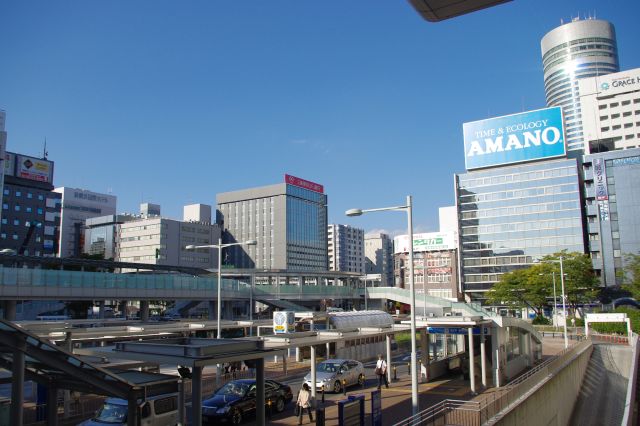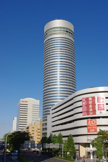2013年9月、新横浜を訪れました。新横浜は横浜駅から内陸側へ10分強程度の距離で、東海道新幹線の駅があります。駅前は近年改装されて大きな駅ビルが建ち、ロータリーの上に長い歩道橋ができ、新しくきれいな雰囲気になりました。北口側は車通りの多い大きな通り沿いに大きなビルが立ち並び発展していますが、反対側の篠原口は対照的に低層住宅地の点在する緑の丘陵地になっています。駅の西側には日産スタジアム(横浜国際競技場)と通り沿い北東側には横浜アリーナと、2つの大きな施設がありイベント開催時には人があふれます。円柱形で一際目立つ高層ビルは42階建ての新横浜プリンスホテルです。