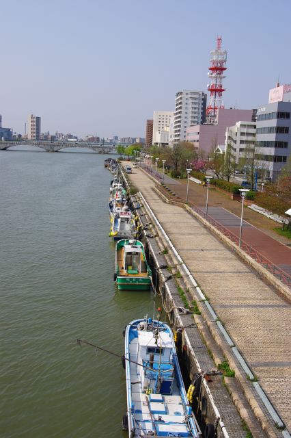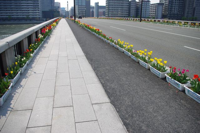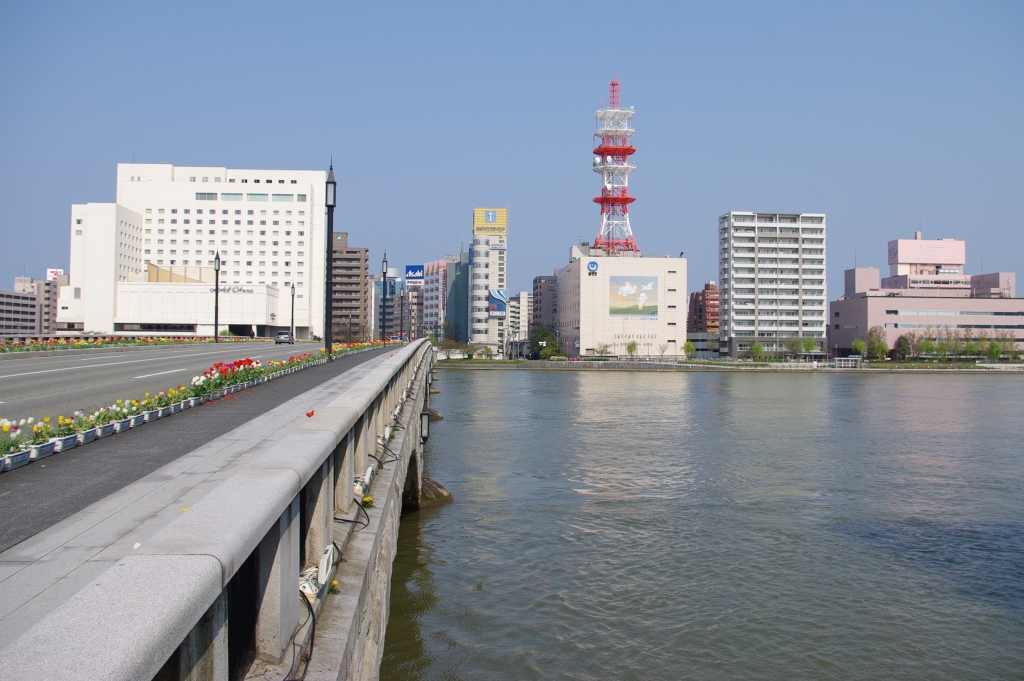 2014年4月、新潟旅行に行きました。萬代橋は信濃川に架かる長さ306.9mのアーチ橋で国の重要文化財に指定されています。現在の橋は1929年(昭和4年)に作られた3代目ですが初代は1886年(明治19年)と歴史があり、新潟地震にも耐えたこの橋は新潟のシンボルとして愛されています。日本一長い川である信濃川の河口部にあるため橋はかなり長く感じました。川から吹き付ける風が強く、風景は開放的で新潟中心部のビル群の並ぶ都市風景が眺められます。またこの時は長い橋と周辺にチューリップが延々と並べられていて美しい光景でした。柳都大橋(りゅうとおおはし)はさらに河口側にある2002年完成の橋で、長年の課題であった萬代橋の河口側に橋がない不便さを解消しました。