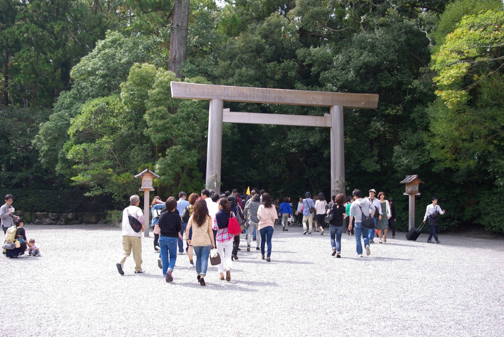 2014年、出雲・伊勢旅行に行きました。伊勢神宮(正式には「神宮」)は内宮、外宮(げくう)と2つの正宮があり、ならわし通りに外宮から訪れました。外宮は正式には豊受大神宮とよばれ、食物・穀物を司る豊受大御神(とようけのおおみかみ)を主祭神とする神社で、衣食住やあらゆる産業の守り神とされます。創建は5世紀頃で、雄略天皇が内宮祭神である天照大御神から夢の中で信託を受け、豊受大御神を迎えて祀ったとされています。伊勢神宮は日本人の心のふるさととされる場所であり、この日もたくさんの参拝者が訪れていました。20年ごとに行われる式年遷宮の資料館の「せんぐう館」を見学し、緑深い参道を抜け巨木の林立する正宮前で参拝しました。