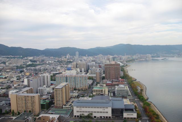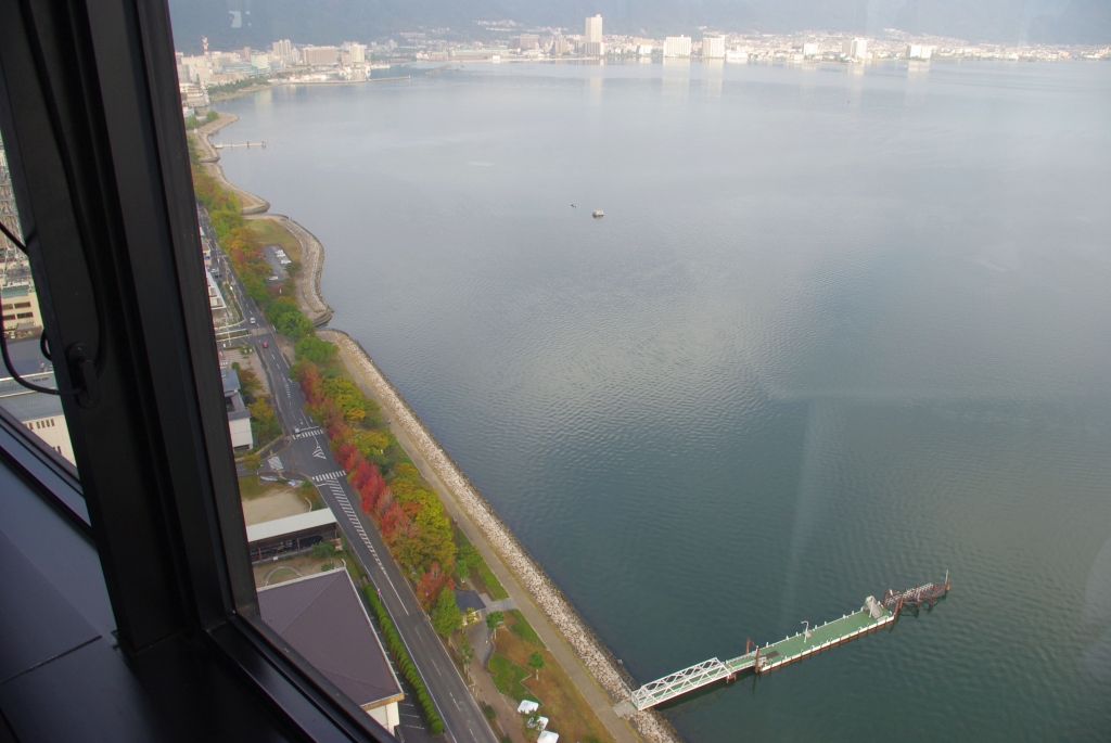 2014年、出雲・伊勢旅行に行きました。伊勢神宮を訪れる前に滋賀県の大津プリンスホテルで宿泊しました。琵琶湖のほとりに立つ38階建て、高さ133mの高層ホテルで、滋賀県で最も高いビルです。ホテルの高層階からは日本一の広さを持つ琵琶湖や、西側に比良山地、東側に鈴鹿山脈の山並みという広範囲の風景を眺めることができます。一方周辺の大津市街は平地部にビルやマンションが林立している姿が印象的でした。