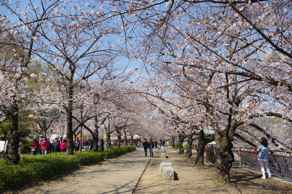 2019年4月、大阪・京都旅行に行きました。大阪城は1583年(天正11年)に豊臣秀吉により築城され、1615年(慶長20年)の大坂夏の陣で落城しました。二代目は1629年(寛永6年)に徳川秀忠が豊臣色を払拭する形で改修しましたがその後落雷で消失し、1931年(昭和6年)には現在の三代目の天守閣が再建されました。大阪城には約3000本の桜がある名所で西の丸庭園が特に有名ですが、森ノ宮駅から大手門までの南外堀沿いにも桜並木が続き、大きな堀や石垣と共に桜を楽しむことができます。