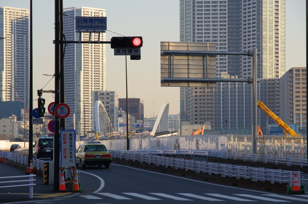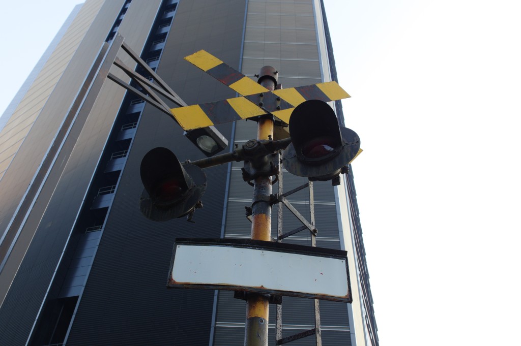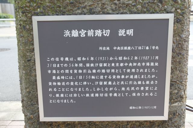 2021年1月、新橋・浜松町周辺を散策しました。浜離宮前踏切は汐留貨物駅と東京市場駅(築地市場)を結んでいた貨物線、通称「東京市場線」の踏切跡です。昭和6年(1931)から昭和62年(1987)まで使用され、鮮魚列車などが運行されて東京の食を支えていましたが、汐留貨物駅と共に廃止されました。汐留貨物駅から伸びる線路は汐留川(現在の海岸通り、高速道路)を渡り、その先に踏切がありました。線路は築地川(新尾張橋)を渡り築地市場へ入り、円弧を描く建屋へ続いていました。線路跡は現在は道路になっており、交差点に立つ踏切は「銀座に残された唯一の鉄道踏切信号機」として保存されその歴史を伝えています。