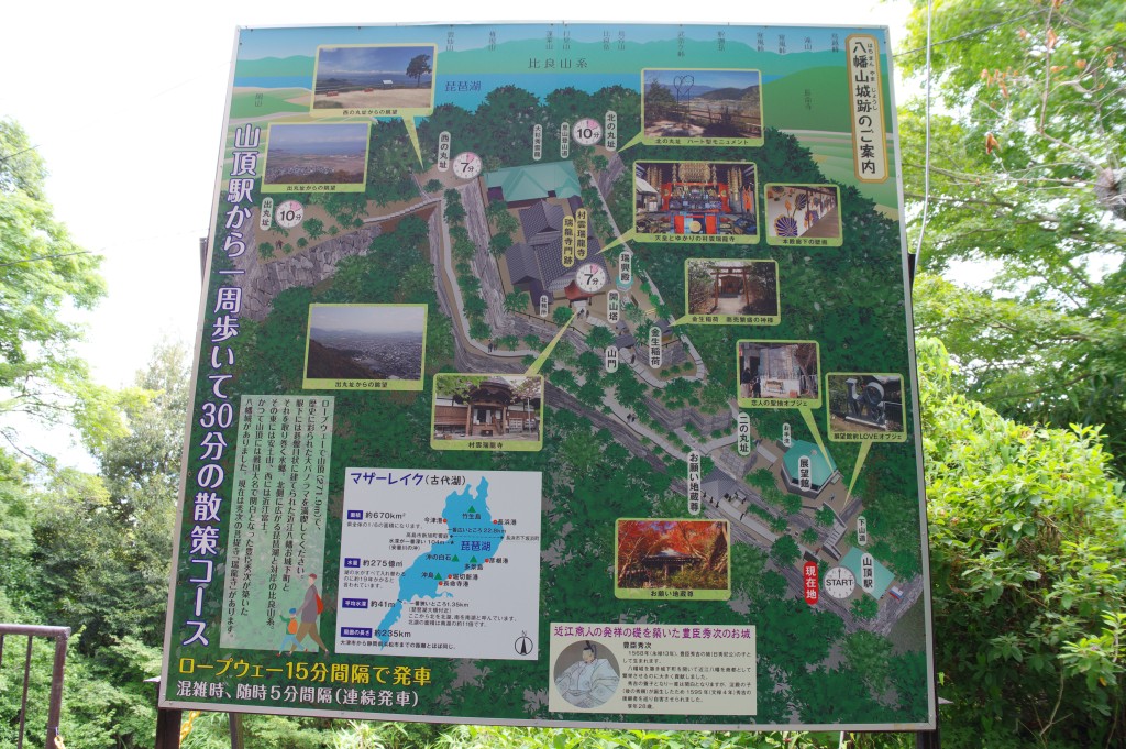 秀次は後継者争いのため28歳で自害させられた「秀次事件」でも知られ、本丸には秀次の菩提寺の瑞龍寺があります。本丸の他に二の丸、西の丸、北の丸、出丸があり石垣が残り、琵琶湖や安土山や近江八幡の市街地などの幅広い眺望が見られます。山上へはロープウェイでアクセスできます。