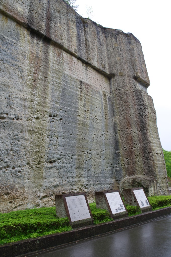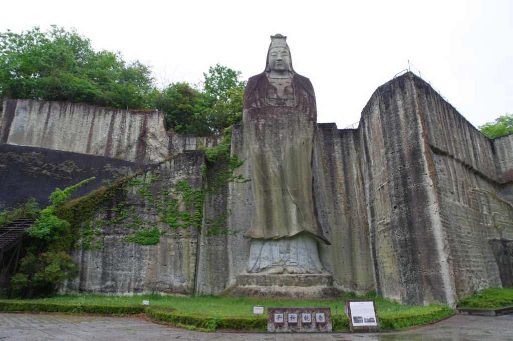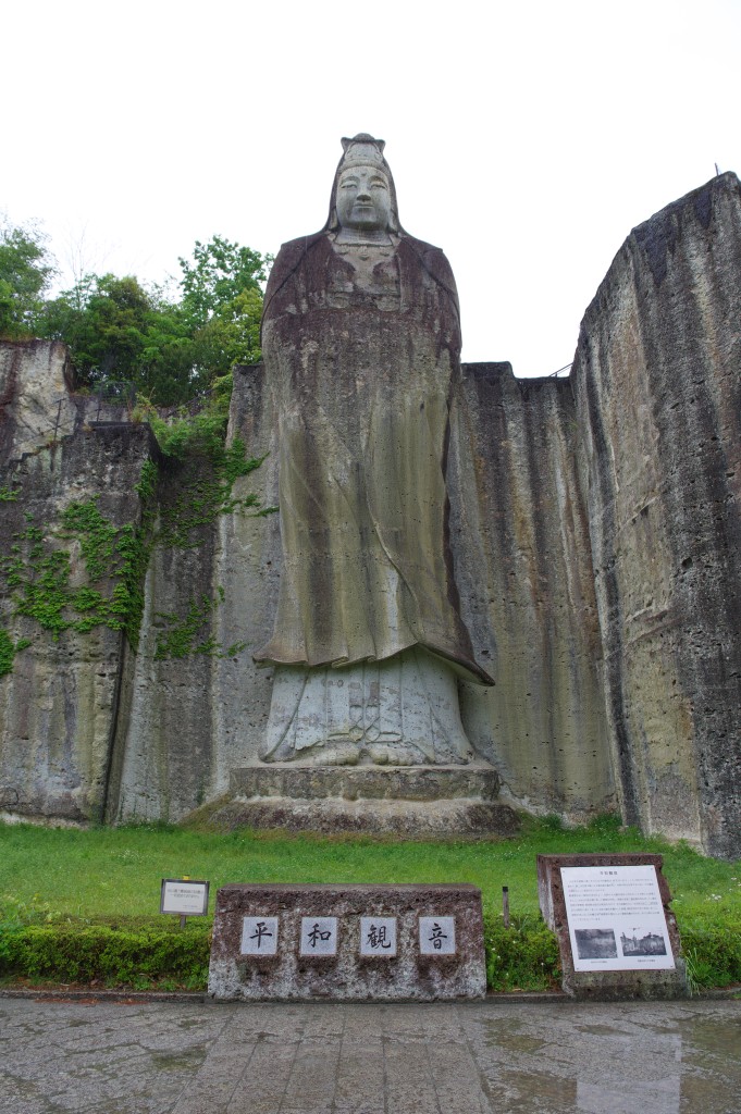 2024年4月、足尾と宇都宮へ旅行に行きました。平和観音は宇都宮市大谷町にある石仏です。太平洋戦争の戦没者を追悼し世界平和を祈念するために、近くにある大谷寺のお前立ち観音として、採掘場跡の大谷石凝灰岩に昭和23年(1948年)から6年かけて手彫りで作られました。高さは約27mで階段で登ることもできて町並みを一望できます。像の前は広場になっています。