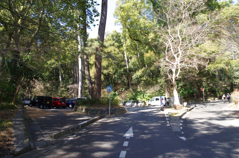 道は地形に沿って下って上ります。奥の方には有料駐車場あります。道の左右の木々の先には海が見えて岬という感じがします。