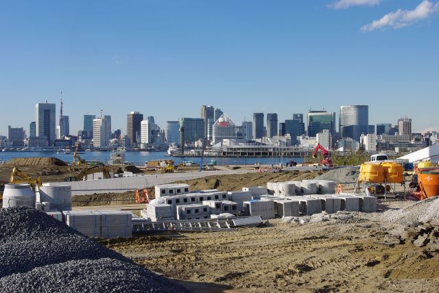 市場横の敷地は工事中。晴海、新橋方面が見える。