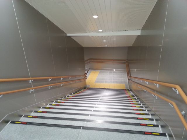 ・真新しい階段はさほど広くない。エスカレーターやエレベーターはない。