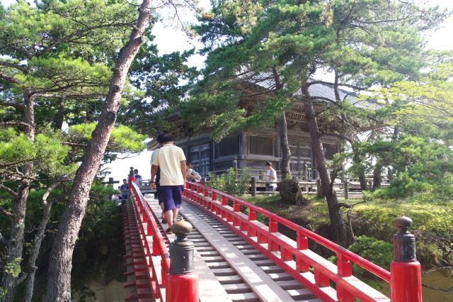 足元がオープンな赤い橋を渡り、海に突き出たお堂へ。伊達政宗が再建した東北最古の桃山建築です。