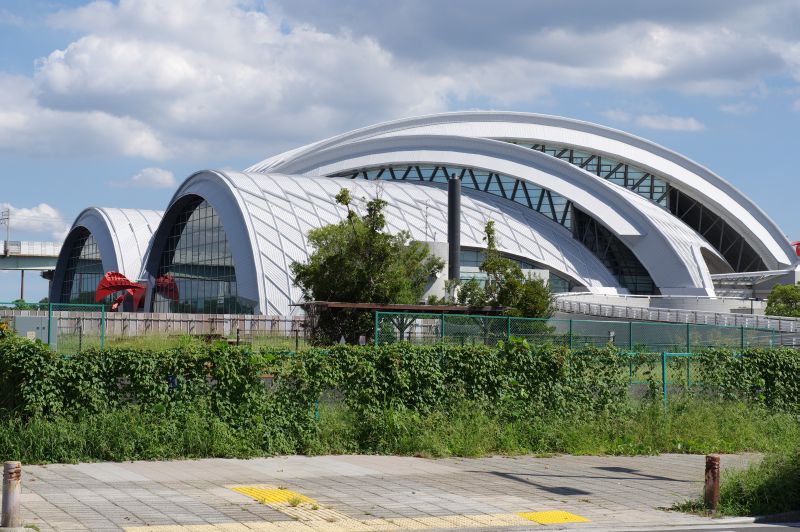 ・公園の東側に東京辰巳国際水泳場、曲線的な構造が印象的