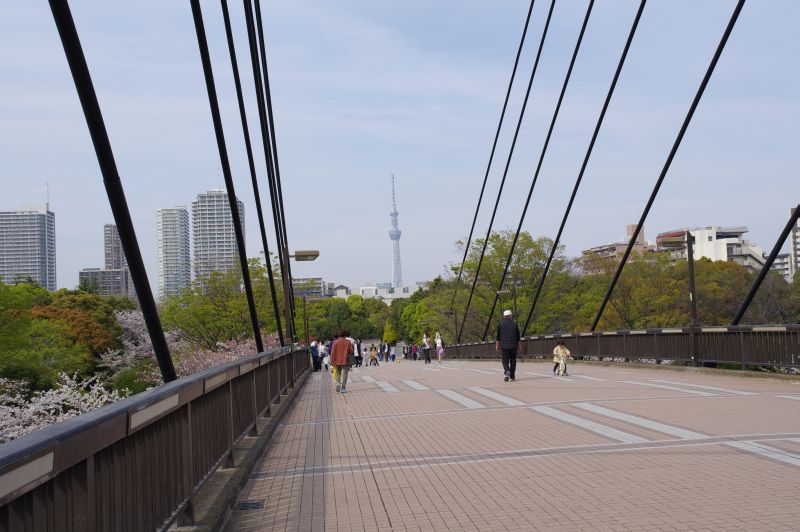 住吉駅付近にある大きな公園で、主に道路の北側が桜スポットです。東側はシンボルの時計塔のある広場を挟むように桜並木が続きます。時計塔と東京スカイツリーとの共演は映えますね。西側は子供たちの遊具があったり、大きな桜の木が点在してその下で憩う人たちがいました。