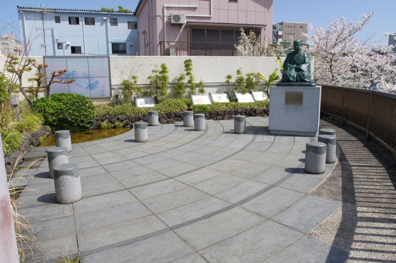 川の分岐点の角の展望スペース。芭蕉の像があります。
