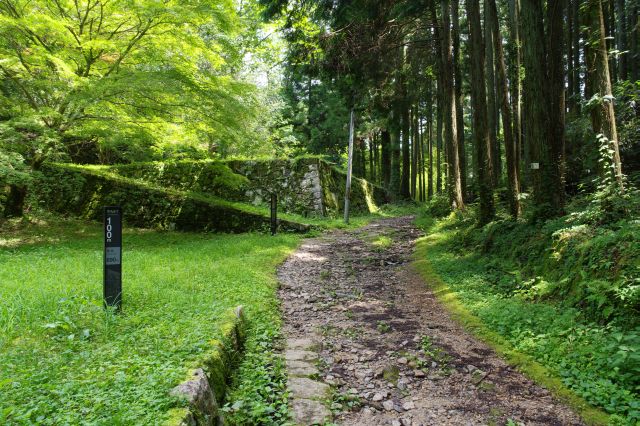 山城らしく急な坂道が続きます。自然の中、自然の空気、苔、蝉の声、上の方ほど水の流れ、高木が林立します。