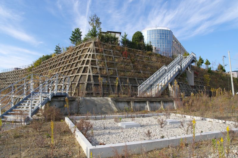 囲われて埋め込まれたような形になっているのは、かさ上げ前の地面の高さのため低い位置にあるからです。これだけかさ上げをしたという事も実感できます。