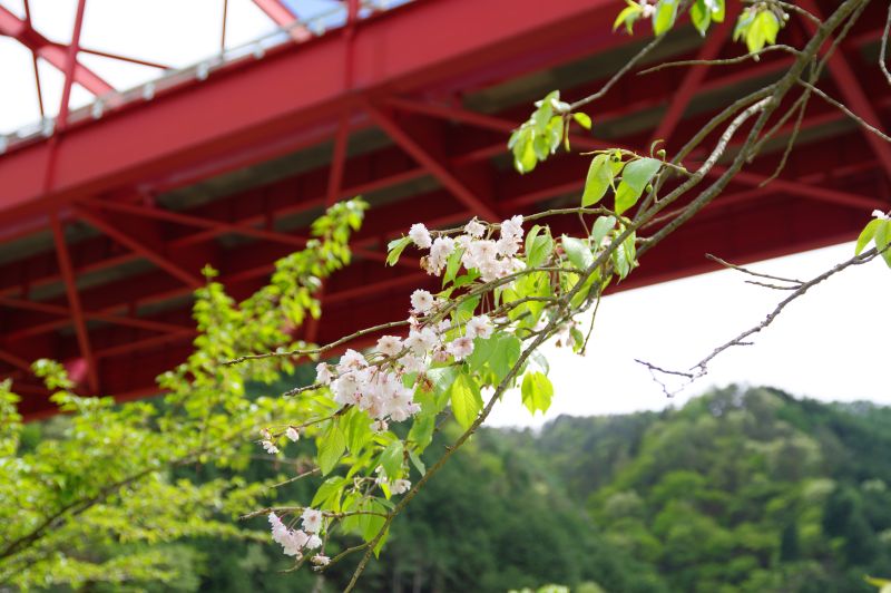 頭上の赤い橋を見上げるのもダイナミックで良いですね。いくつかの木があり、4月末で時期的に桜は散っていますが、まだ少し咲いてる木がありました。