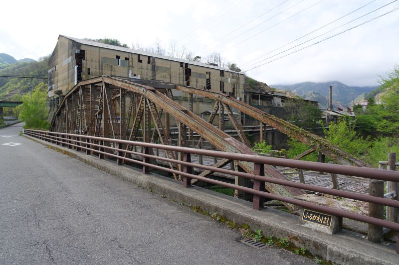 左手には古河橋という錆びた古い橋、そして奥には大きな廃墟の建物があります。