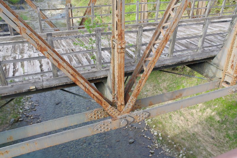 元はこの狭い古河橋が使われていたようですが、今は柵があり通れず隣の橋に車道があります。良く見ると床が木の板で腐食しています。足元の川岸は生々しい崖になっていて結構高さがあります。