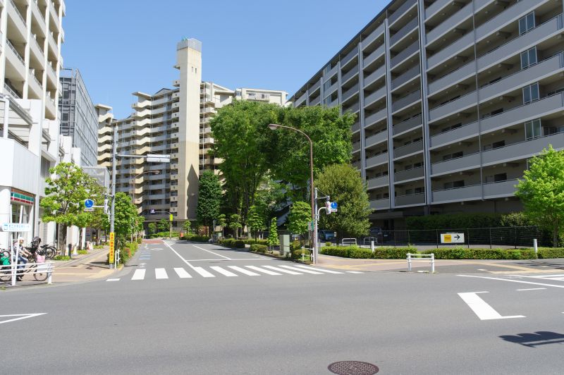 大通りの少し南の交差点を東へ進みます。大きなマンション群が建ち並ぶエリアです。