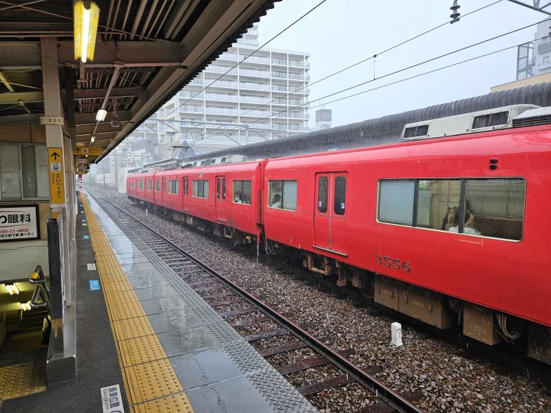 名鉄は慣れてないので駅構内でちょっと迷いました。なんとか探して1番線に降りました。ホームでは2分毎という相変わらず列車の出入りが多いです。前述のダイヤ乱れのため順番が入れ替わってますね。